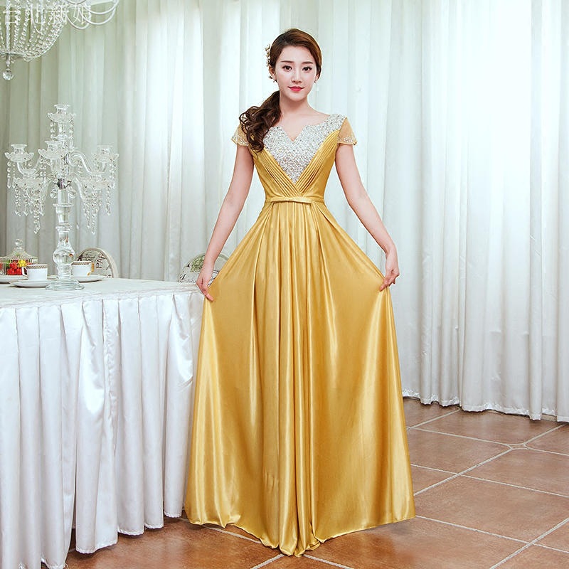 [真丝礼服] 2018新款新娘修身敬酒服 晚宴V领钉珠长款礼服女 主持人晚礼服